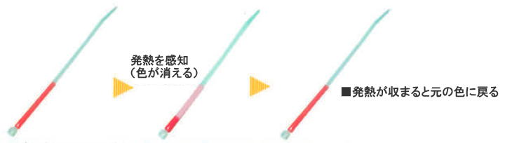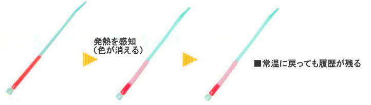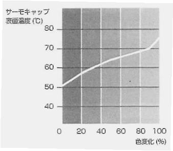 | ●色の変化で発熱を予測 サーモシリーズの素材は、グラフのようなアナログ特性を持っているため、設定温度に近づくと色が変化(消色)し始めます。 ●設定温度について 標準タイプの設定温度75℃は、多くの実装試験を経て、次のような理由から設定しました。 ・手を触れると火傷をする危険性を示す温度であること。 ・機器の不具合による異常発熱の兆候を示す温度であること。 ・外気温の上昇や、機器の通常運転による温度上昇と区別できる温度であること。 |