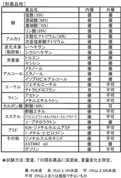 <注意> ※耐薬品性は湿度など、使用条件により変化します。 ※表中の値は溶出や物性変化の状況を示すものではありません。 ※保証値ではありません。チューブの選択はお客様側で必ず確認試験を行ってください。 ※本製品は直接人体に接触する用途では使用できません。 |