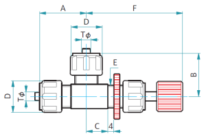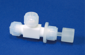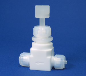 ニードル式で流量調整ができ、耐圧は0.3MPa以下、接続は、フッ素樹脂チューブPTFEかPFAをフレアー式に固定します。