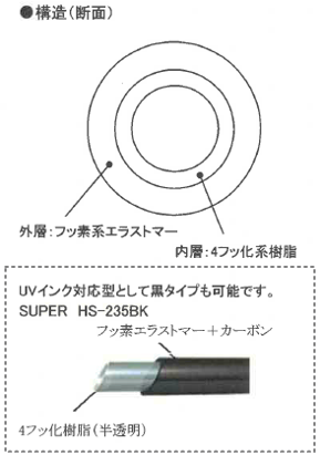 特長: ・内層は4フッ化系樹脂、殆どの薬品に耐性があります。 ・曲げ特性に優れています。 ・最高温度 約120℃で連続使用できます。 ・複層構造でガスバリア性に優れています。 ・難燃性クラス:UL94V-0 色: 淡いピンク透明 ※外層黒タイプも可能です。 |